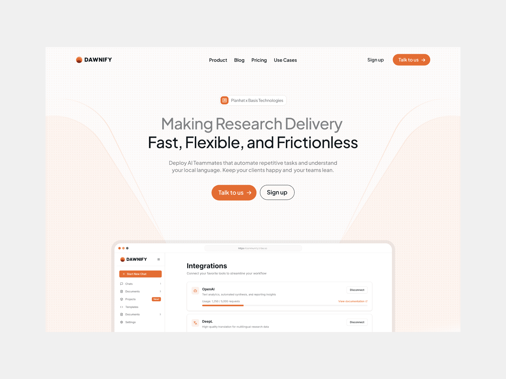 Dawnify is a clean Framer-built landing page for an AI-powered research assistant platform. The website presents Dawnify as a solution for research tech companies, market research firms, and independent researchers — offering AI teammates that automate repetitive tasks, handle multilingual data, and speed up research delivery. Users can transcribe interviews, generate insights, translate content in 40+ languages, and produce ready-to-use reports — ultimately making research fast, flexible, and frictionless.